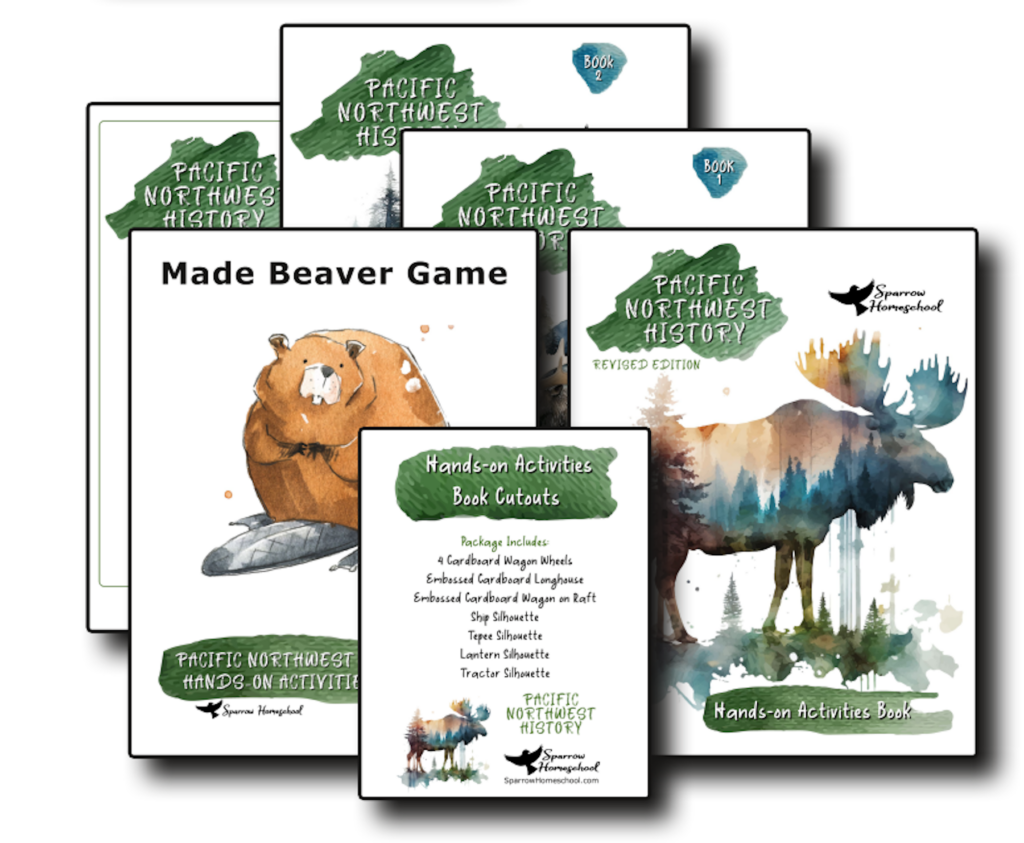 The Full Kit includes everything in the Basic Kit plus what you need to add hands-on learning to the curriculum. There is at least one hands-on activity for each of the 24 chapters of the Pacific Northwest History curriculum. The Full Kit includes the Hands-on Activities Book, a game that goes with the Fur Trade chapters, and a set of cutouts for 7 of the activities. Cutouts include: 4 cardboard wheels, an embossed cardboard longhouse, an embossed cardboard wagon on a raft, and silhouettes of a ship, tepee, lantern, and tractor. Activities include science experiments, watercolor and acrylic paintings, crafts, and popsicle stick engineering projects.